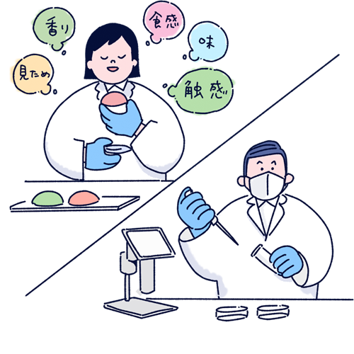 味や香り、食感などを人の五感を通して評価する官能検査と、食品中の微生物の有無や数を調べ、安全性と衛生状態を確認する細菌検査について、知識の習得と実技を行います。